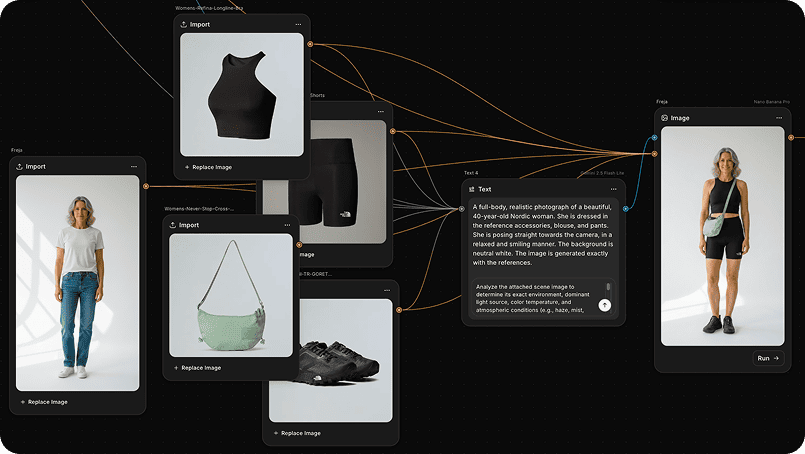 VIVA es un sistema que ayuda a marcas y e-commerce a mantener una presencia visual coherente y actualizada, sin depender de sesiones de fotos constantes, reduciendo costes y acelerando la creación de contenido.